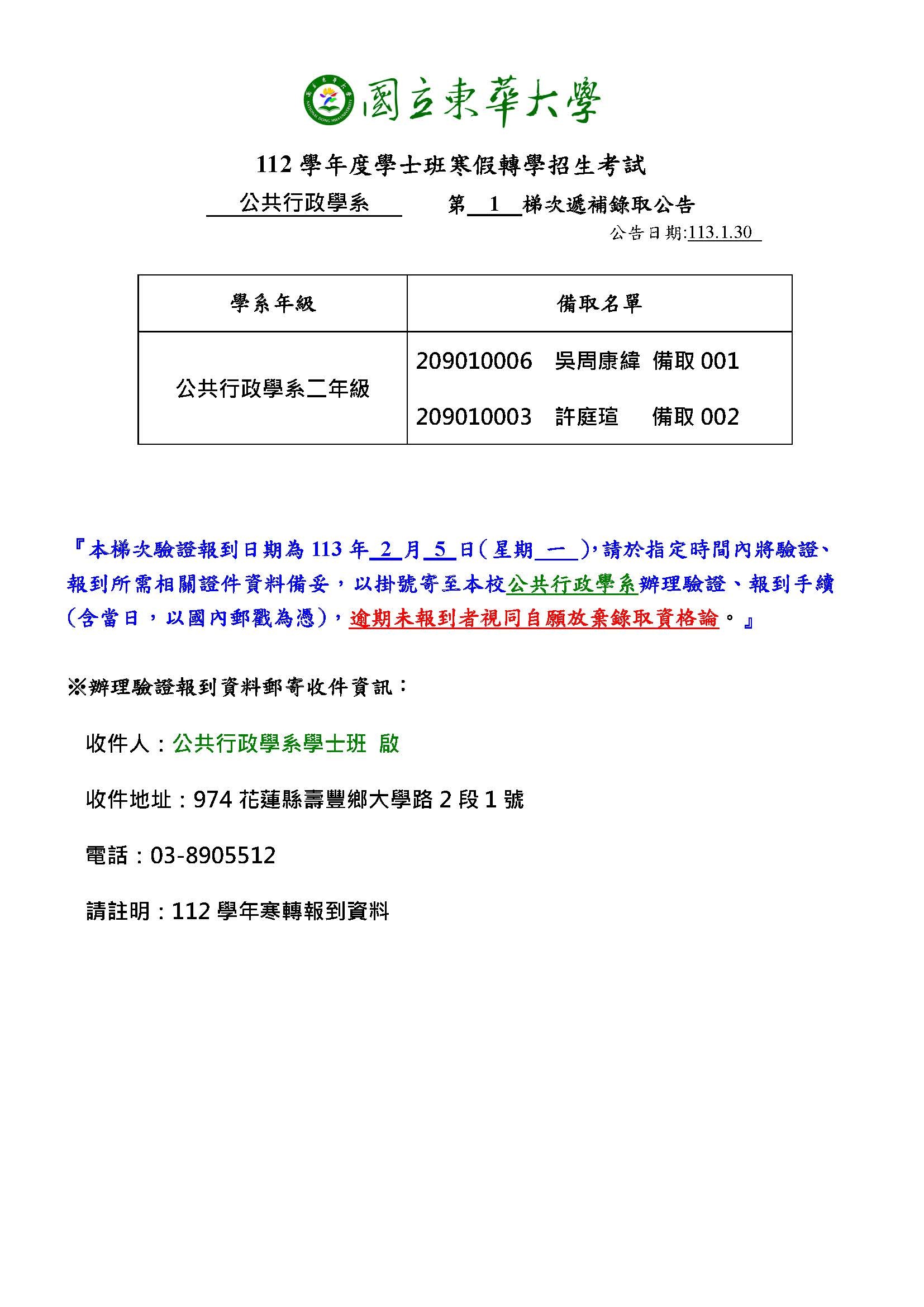【公行系112學年學士班寒假轉學】備取生第一梯次遞補錄取公告1130130