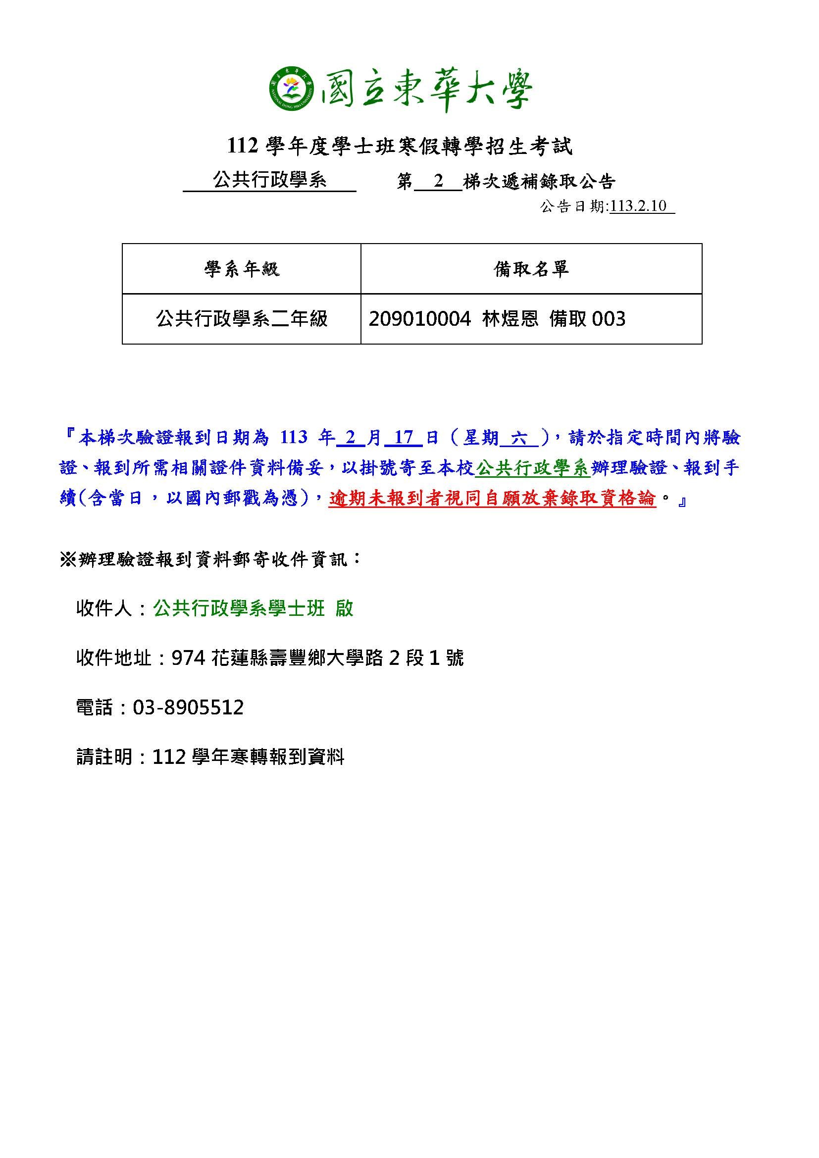 【公行系112學年學士班寒假轉學】備取生第二梯次遞補錄取公告1130210